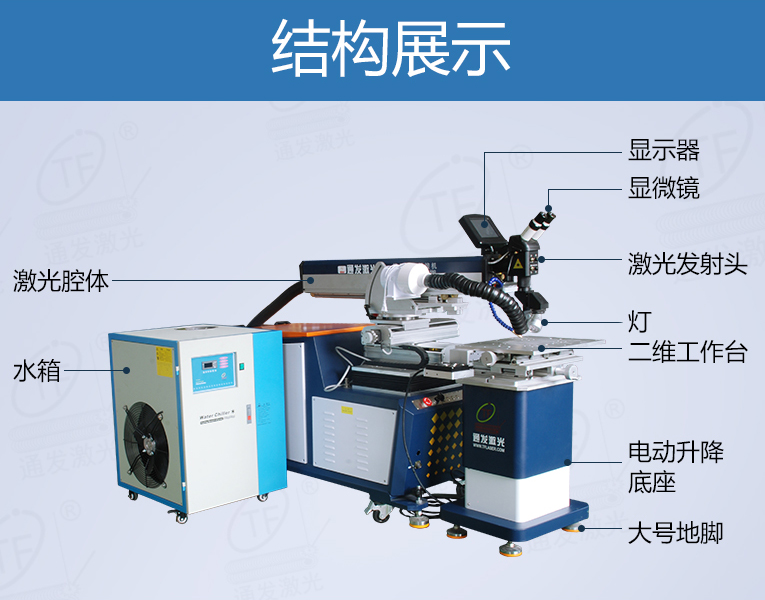 通發(fā)激光一體式模具激光焊機TFL-200YT/TFL-400YT是一款多種功能融合一體的新型模具激光焊接機,針對特大型塑料模具激光焊、中型注塑模具激光燒焊、小型塑膠模具激光補焊、壓鑄模激光補焊具等各類模具可實現(xiàn)超精密修復(fù),幫您解決大型汽車模具修復(fù)難題,不需要模具移動,電動工作臺與立體旋轉(zhuǎn)激光頭完美結(jié)合,操作桿控制運動移動實現(xiàn)輕松激光修復(fù)大型模具,同時也保留了傳統(tǒng)手動工作臺超精密修復(fù)模具功能。